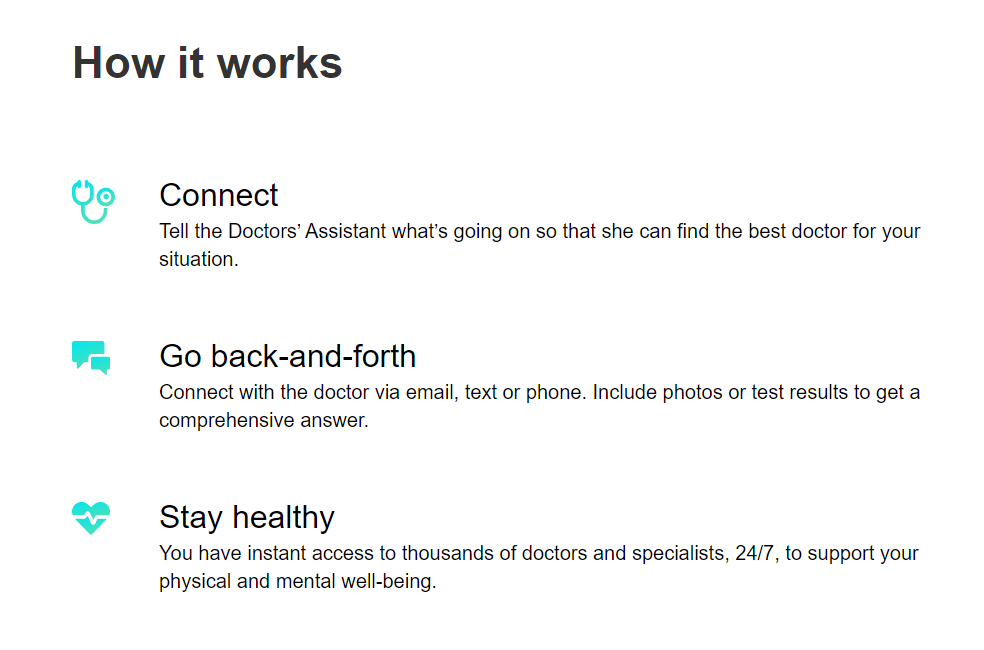 You’ll ask a question, and an expert will answer you. The company states that most questions are answered within 5 minutes, with responses taking up to 24 hours in certain situations. You have unlimited follow-up questions with the doctor until you are satisfied with the results. You can send in photos for the doctor to analyze if there is a skin condition, for example.